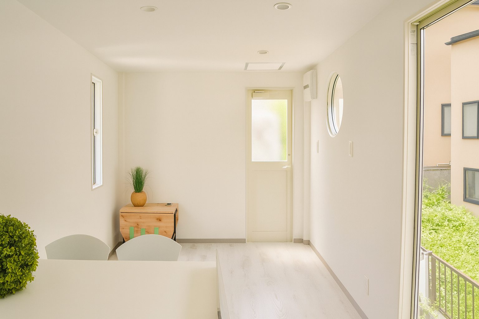窓には工場生産トレーラーでは難しいとされる「丸型のフィックス窓」を採用。